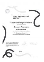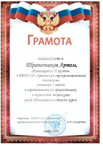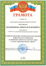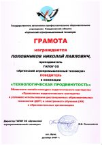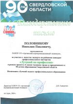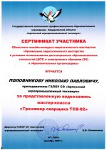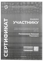 Половников первая квалификационная категория по должности «преподаватель» срок действия с 13.02.2025г. Основы технического черчения, Основы инженерной графики Основы материаловедения и технология общеслесарных работ, физика, Материаловедение; Допуски и технические измерения; Подготовительно-сварочные работы и контроль качества сварных швов после сварки; Основы технологии сварки и сварочное оборудование; Технология производства сварных конструкций; Подготовительные и сборочные операции перед сваркой; Контроль качества сварных соединений; Ручная дуговая сварка (наплавка, резка) плавящимся покрытым электродом; Техника и технология ручной дуговой сварки (наплавки, резки) покрытым электродами; Ручная дуговая сварка (наплавка) неплавящимся электродом в защитном газе; Техника и технология ручной дуговой сварки (наплавки) неплавящимся электродом в защитном газе ОПОП, в которых осуществляет педагогическую деятельность 35.02.16 Эксплуатация и ремонт сельскохозяйственной техники и оборудования 35.01.11 Мастер сельскохозяйственного производства 35.01.27 Мастер сельскохозяйственного производства 35.01.15 Мастер по ремонту и обслуживанию электрооборудования в сельском хозяйстве 15.01.05 Сварщик (ручной и частично механизированной сварки (наплавки) 08.01.07 Мастер общестроительных работ Нет Нет 2016 г Профессиональная переподготовка «Образование и переподготовка», ГБПОУ СО «Красноуфимский педагогический колледж», Профессиональная переподготовка «Специалист в области охраны труда», ЧОУ ДПО «Инженерная Академия», предоставляет право на ведение профессиональной деятельности в сфере «Охрана труда». 2019 г. «Информационно-коммуникационные технологии в деятельности педагогов профессиональной образовательной организации», (40 часов), ГАОУ ДПО СО «ИРО» «Развитие профессиональной компетентности специалистов, привлекаемых к осуществлению всестороннего анализа профессиональной деятельности педагогических работников, аттестующихся в целях установления квалификационных категорий в условиях подготовки к введению национальной системы учительского роста», (16 часов) ГАОУ ДПО СО «ИРО». «Компьютерные технологии в материаловедении, применяемые в производстве на предприятии АО «Артинский завод» (в форме стажировки). (24 часа). 2020 г. «Эксперт по оценке демонстрационного экзамена по стандартам WORLDSKILLS по компетенции «Сварочные технологии». Академия WORLDSKILLS. 2021г. «Работа на сварочном оборудовании производства фирмы KEMPPI OY (Финляндия)» 2022г. «Инновационные производственные технологии в среднем профессиональном образовании по компетенции «Сварочные технологии» (40 часов), ГАПОУ СО «Уральский политехнический колледж – МЦК». «Практическая подготовка обучающихся в соответствии с современными стандартами и передовыми технологиями. Инженерный профиль. Сварочное производство» (94 часов) ФГБОУ ДПО «ИРПО»,г. Москва «Практическая подготовка обучающихся в мастерских, оснащенных современной материально-технической базой по компетенции», 48 часов, ЦОПП ГАПОУ СО «Уральский колледж строительства, архитектуры и предпринимательства» 2023г. «Эксперт демонстрационного экзамена», ФГБОУ ДПО «ИРПО»,г. Москва «Актуальные вопросы истории России в современных реалиях», (16 часов), Единыйурок 2015г. Благодарность ГБПОУ СО «Артинский агропромышленный техникум» за высокое каче